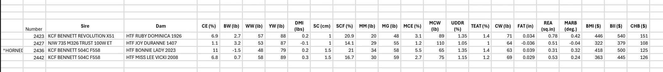 Predicted EPDs and parentage for all available bulls